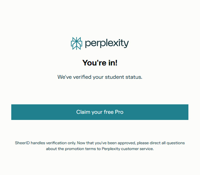B6: Sau khi xác minh thành công qua email .edu, bạn sẽ được cấp quyền sử dụng Perplexity Pro miễn phí (thời gian từ 1 tháng đến 2 năm tùy vào từng trường hợp). Nhấn “Claim your free Pro” để hoàn tất.